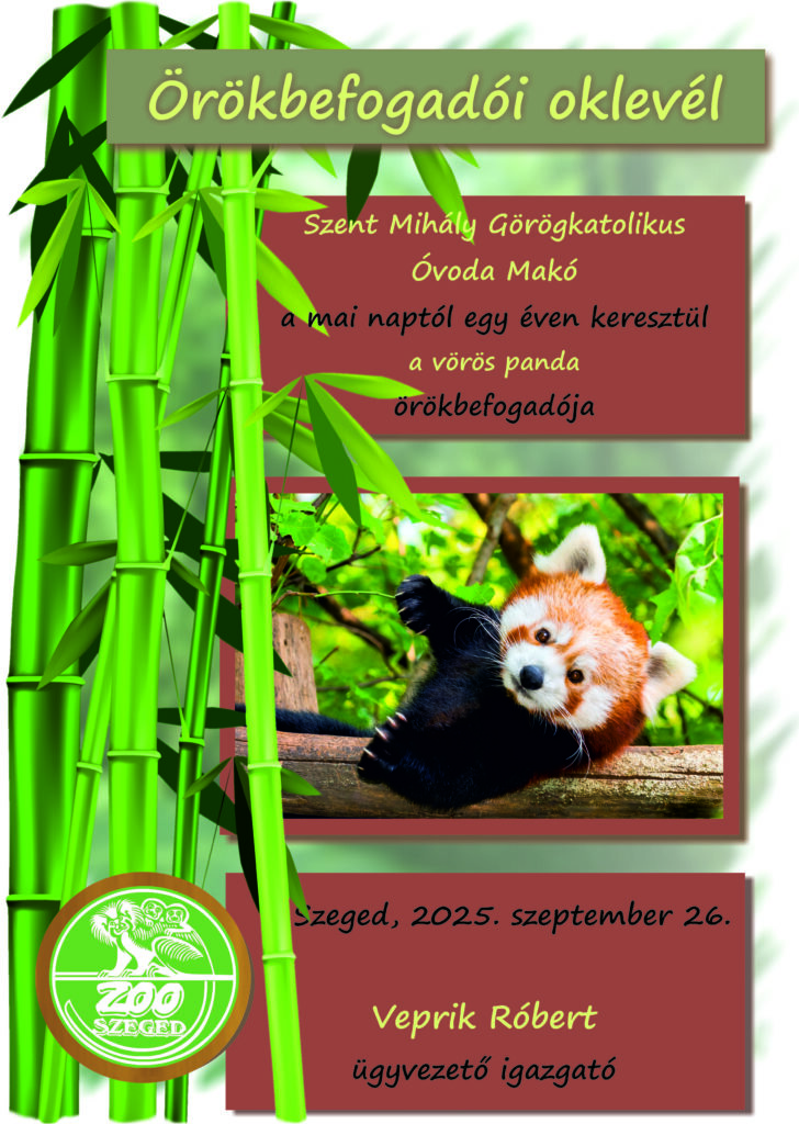 A szegedi Vadasparkból egy évre örökbe fogadtuk a vörös pandát ezzel is támogatva az intézményt. Az állatok iránti szeretet és gondoskodás érzésének megerősítésével hozzájárulunk a környezettudatos és empatikus személyiségformáláshoz. Célunk, hogy ezek az élmények hosszú távon is nyomot hagyjanak a gyermekek szemléletében.